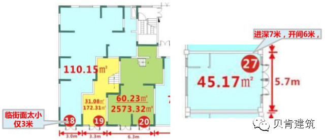 ③ 一层临街展示面小,二层临街展示面大