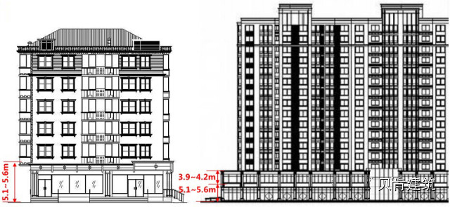 商业层高:住宅底商一层层高宜为5.1~5.6m(为后期改造、增加夹层留出足够的空间),二层层高宜在3.9~4.5m之间。根据项目情况的不同,底商层数宜选择一层或两层。