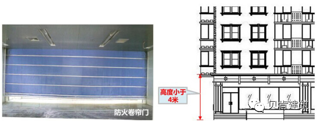 ◆小型商业用房底层直通室外的出口处不宜设置卷帘门;当必须设置卷帘门时,应在卷帘旁或卷帘上设置一扇向外开启的平开门,或采用镂空卷帘;