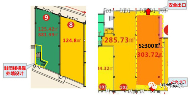 ◆疏散距离超过上述规定的商业区域时,应设置隔墙和门与楼梯分隔开,且房间内最远点至房间门的距离不应大于15m,底层楼梯口距离直接对外安全出口不应超过15m。