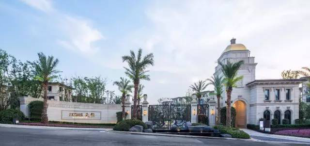 举个例子,龙湖江与城天钜项目入口大门做到了46米的形象展开面,铸铜大门高达6.8米,门廊顶部帖以金铂饰面,做出了酒店式入口的尊贵感。