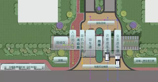 一般高端项目尤其是别墅区,应该注重车行道的流畅与安全。刚需房主入口应该满足功能就可以了,要突出最多也是强调居民出入的便利。