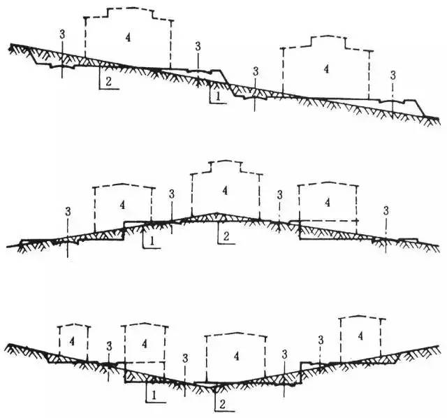 场地设计地面形式是将自然地形改造成为满足使用功能的人工地形,依据不同的自然地形坡度,可分别设计成平坡式、台地式及混合式。