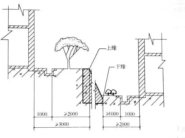 挡土墙和护坡上、下缘距建筑2m,已可满足布设建筑物散水、排水沟及边缘种植槽的宽度要求。但上、下缘有所不同的是上缘与建筑物距离还应包括挡土墙顶厚度(高差大于1.5m时,应在挡土墙或坡比值大于0.5的护坡顶面加设安全防护设施),种植槽应可种植乔木,至少应有1. 2m以上宽度,故应保证3m。下缘种植槽仅考虑花草、小灌 木和爬藤植物种植。