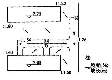 高程箭头法是一种简便易行的方法,即用设计标高点和箭头来表示地面控制点的标高、坡向及雨水流向;表示出建筑物、构筑物的室内外地坪标高,以及道路中心线、明沟的控制点和坡向并标明变坡点之间的距离;必要时可绘制示意断面图