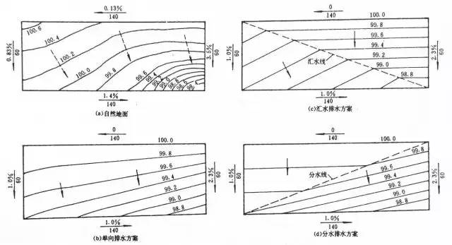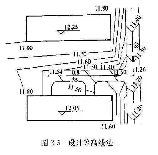 设计等高线法是指用等高线表示设计地面、道路、广场、停车场和绿地等的地形设计情况。一般用于平坦场地或室外场地要求较高的情况。设计等高线法表达地面设计标高清楚明了,能较完整表达任何一块设计用地的高程情况。