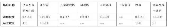根据《城市用地竖向规划规范》(CJJ83-99)规定:广场竖向规划除满足自身功能要求外,尚应与相邻道路和建筑物相衔接。广场最小坡度0.3%,最大坡度平原地区为1%,丘陵和山区为 3%。