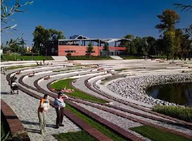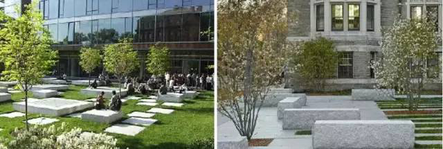 景观矮墙在这类设计中是设计师一贯的宠儿。它首先在平面上具有较强的构成感;其次起到一个分割空间、丰富空间层次的作用;它自身又可以提供人们休憩、交谈,成为一个实用空间;