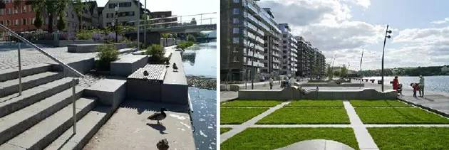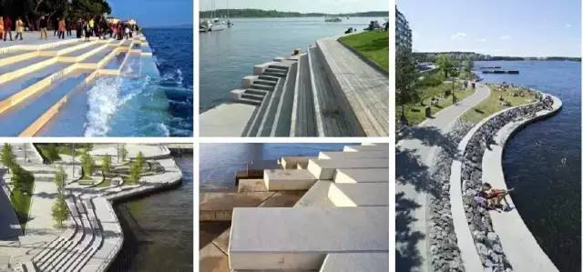 亲水空间要有不同材料的结合使用,不能仅仅是木平台,还要融合绿化在其中。台阶竖向上的变化是滨水空间设计的灵魂。