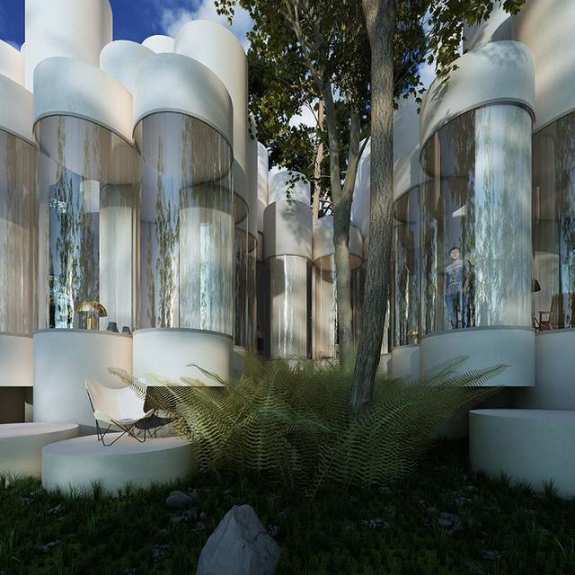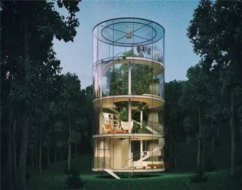 哈萨克斯坦的A.Masow建筑设计工作室打造的透明树屋,是一座绕树木而建的圆柱型玻璃建筑。