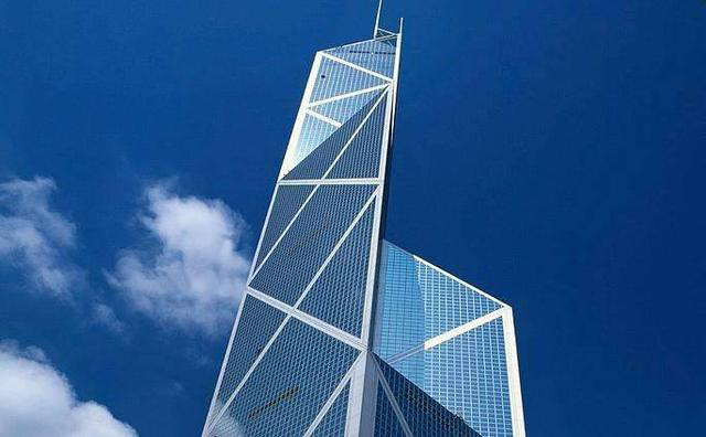香港中银大厦由四个不同高度的三角柱身组成,呈多面棱形,好比璀璨生辉的水晶体,在阳光照射下呈现出不同色彩。这座由玻璃幕墙与铝合金构成的立体几何图形建筑物,巍然矗立在港岛中区,雄视维多利亚港。