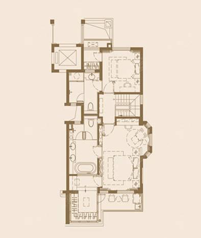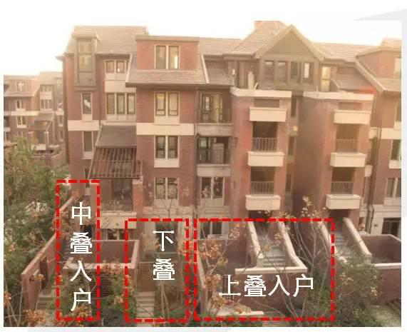 早期的叠加式别墅类似复式住宅上下叠加在一起组合而成,有着与别墅极其相似的立面观感。层数上,一般有四至五层,其中一、二层为一套户型(即下叠套),三、四或五层组成另一套户型(即上叠套)。下叠套户型一般设计有南向独立花园,同时会赠送地下室;而上叠套则会配有北向入户花园及屋顶独立露台。(如下图)
