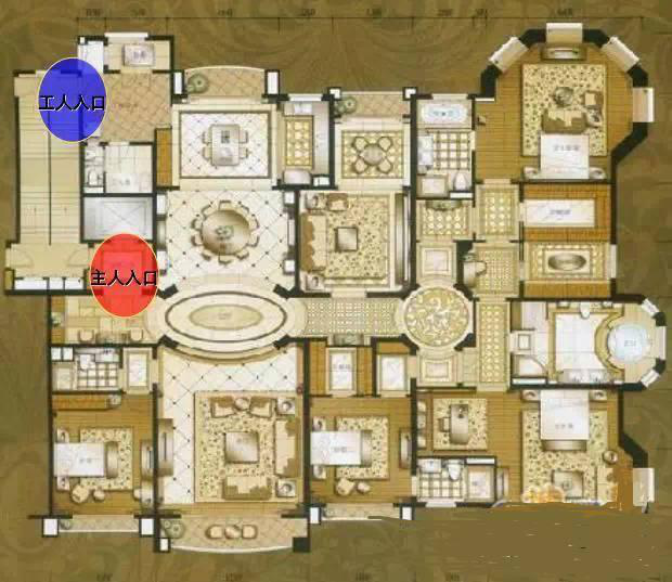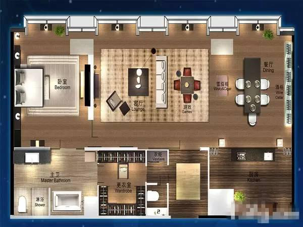 豪宅户型对服务用房的需求较高,应设置充足的工人房、洗衣房、设备房等附属空间。生活功能可设置专门的中西厨,早餐厅,大衣帽储藏间等。休闲功能则有健身,影音,桑拿,红酒雪茄等。