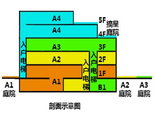 建筑共分5层,1-3层为平层,拥有独立门户,4-5层为复式套型;1-3层均带精装私家庭院及地下室,4-5层全复式设计并设置双层挑高摘星庭院;2层以上均配置私家电梯直接入户,其中2、3层可直达庭院及地下室、超越别墅的尺度:全套房设计、18米超大面宽、3.6米室内层高。