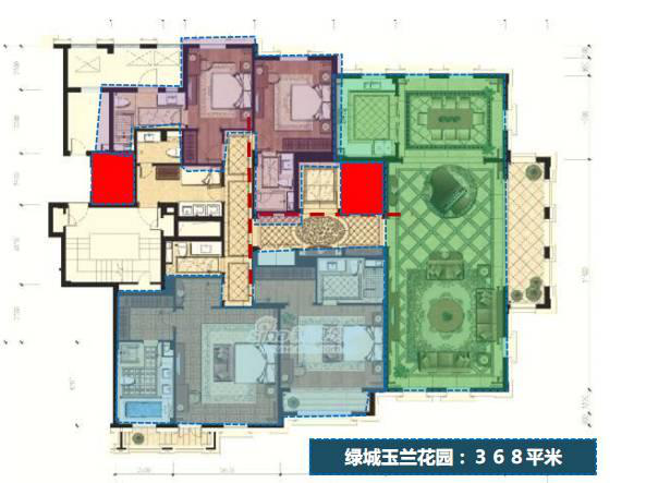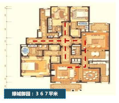 御园户型360㎡以上三房,交通空间处理上突出了过度空间,全套房设计,突出类似别墅的设计理念,御园是十字型布局,并且有两条交通流线。御园做到了个功能空间独立,采用双客厅布局。