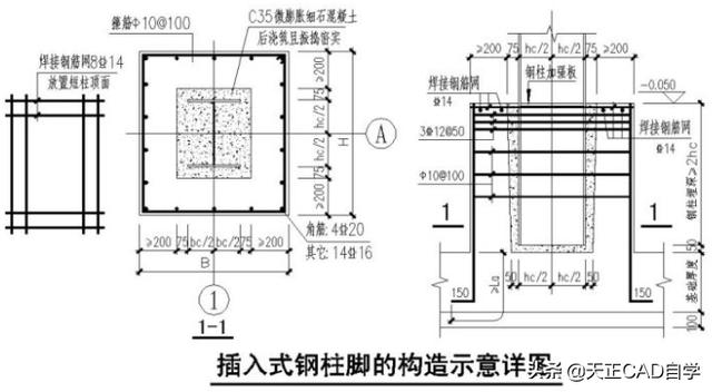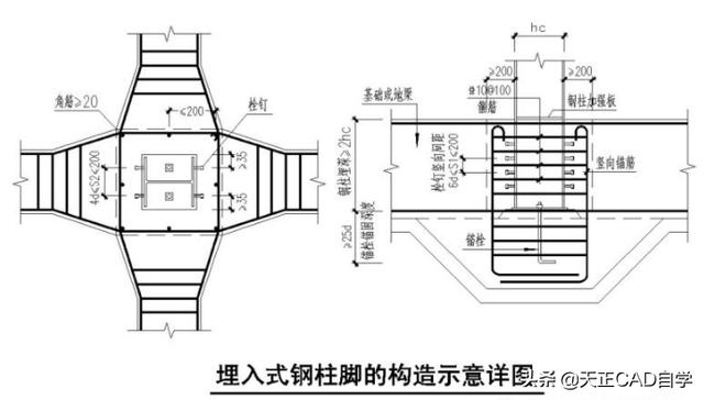 埋入式柱脚的埋深与构造示意图如下: