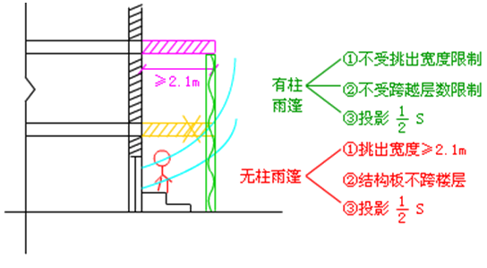16.门廊应按其顶板的水平投影面积的1/2计算建筑面积;有柱雨篷应按其结构板水平投影面积的1/2计算建筑面积;无柱雨篷的结构外边线至外墙结构外边线的宽度在2.10m及以上的,应按雨篷结构板的水平投影面积的1/2计算建筑面积。