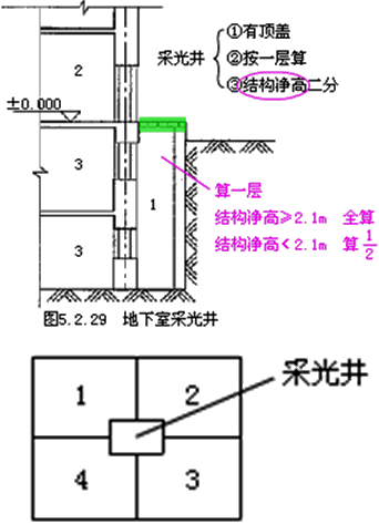 19.建筑物的室内楼梯、电梯井、提物井、管道井、通风排气竖井、烟道,应并入建筑物的自然层计算建筑面积。有顶盖的采光井应按一层计算面积,结构净高在2.10m及以上的,应计算全面积;结构净高在2.10m以下的,应计算1/2面积。