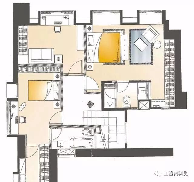 若建筑物的各楼层平面布置相同,则可用两个平面图表达,即只画底层平面图和楼层平面图。这时,楼层平面图代表了中间各层相同的平面,所以,也称中间层或标准层平面图。