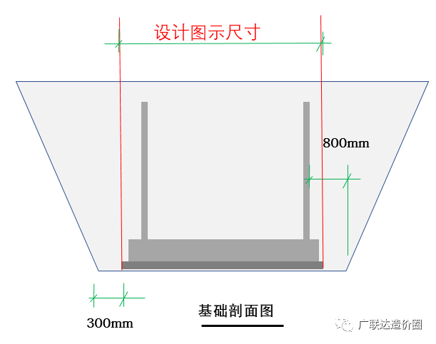 例如,在挖土方过程中,现场为了方便施工把承台之间的土方采用通长挖土施工,如下图按照定额规则承台和条形基础的工作面为300mm,而实际为了砌筑作业和机械挖土作业方便,直接通长挖成直线基槽。