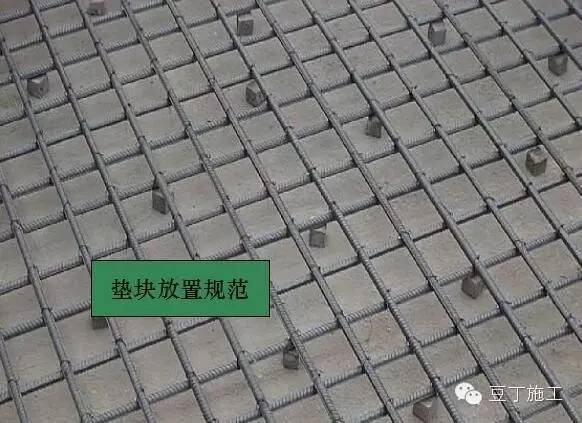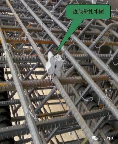 选用合适尺寸的垫块,垫块按梅花状放置,应布置适宜,距离不得过大,并放置牢固,严禁松动、位移、脱落,振捣混凝土时注意防止垫块位移。