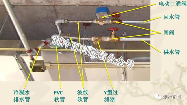 风机盘管进出水管处采用柔性连接方式(如下图),即:在进出水口处安装软管接头,软接头有像胶或金属波纹等类型,主要降低风机盘管在运转时的振动,也可缓冲因其振动使管道接头处或管道受力。