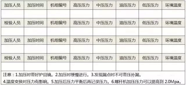 4. 制冷系统的保压压力必须在1.41.5Mpa左右,且保压的时间应在24小时以上,各压力表的初始读数和终点读数必须进行记录;