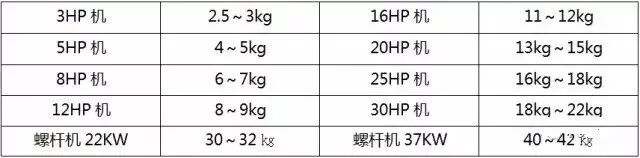 7. 压缩机功率与制冷剂加注量对应表(制冷系统完全没有制冷剂采用定量加液法)