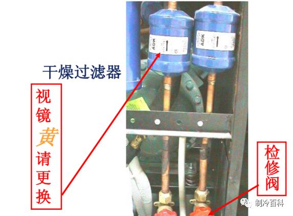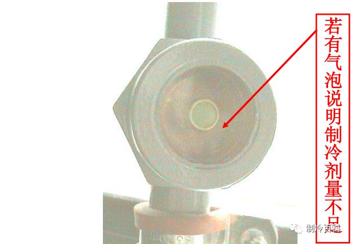 检查制冷管道(焊接处)、干燥过滤器消音器、视镜、维修阀、电磁阀、膨胀阀是否漏液(油)。检查上述器件温度情况,检查管道内是否有水份(看视镜,正常为绿色)