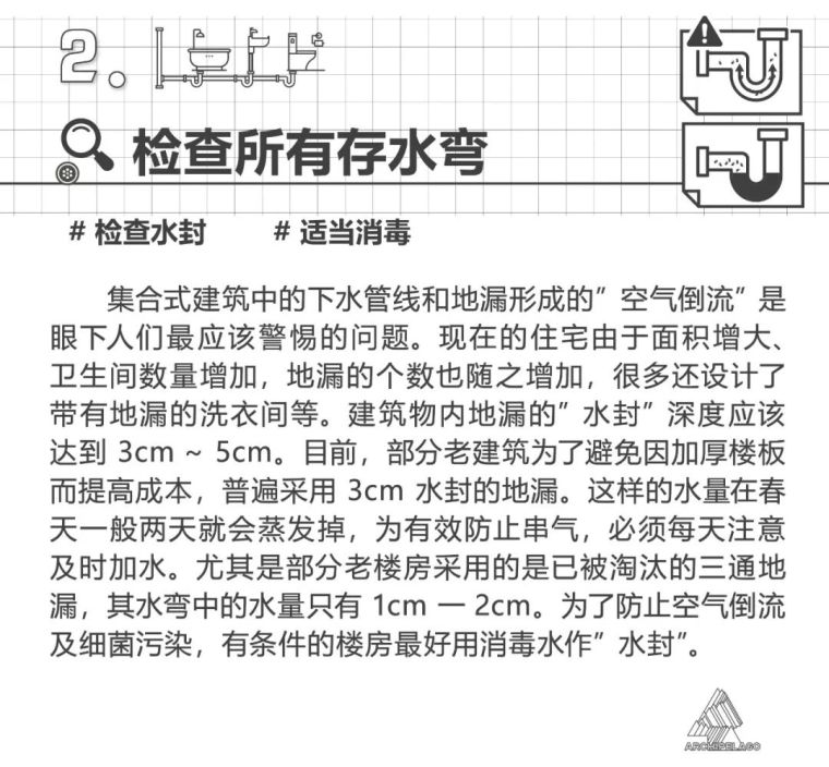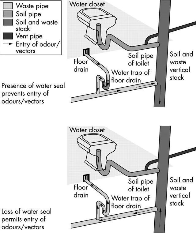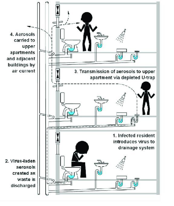 2)在住户的浴室门关上时,开动的浴室抽气扇,可能会将飞沫从排污渠抽进浴室内。