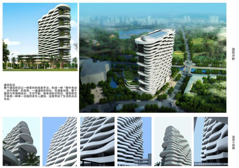 整个建筑形态以一种柔和的线条手法,形成一种静中有动,动中有静的氛围,一道道弧形阳台,充满着动感。整个建筑与环境相结合,生态节能,具有地标识别性。建筑形态不再是一种单一古板的老年人建筑,这里带动了生活的点点色彩。