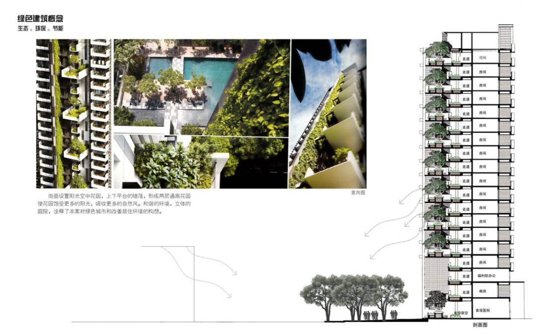 通风、采光活动阳台叠式错开的布置,这样使得每个阳台都可以获得充足的阳光和雨露,阳光及雨露对老人极为重要,只有低层建筑才能享受到的空间在这里都可以享受到。通过阳台及活动平台,让通风可以南北对流,使空中花园与房间空气流通,保持空气清新,同时南北朝向的采光,不但保证光线充足,也可以减少细菌滋生。