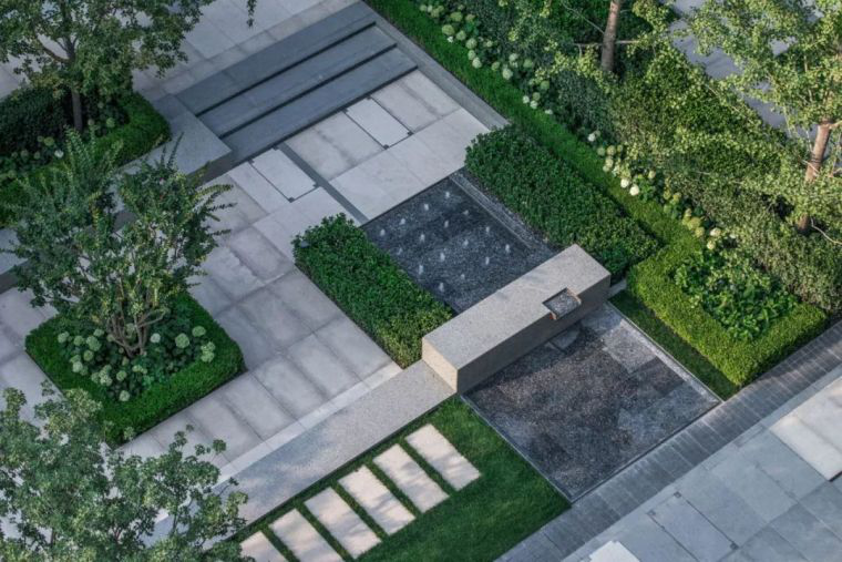 中庭现代水景周围用高低层次丰富的绿篱搭配水景形成上下不同的立体空间层次。