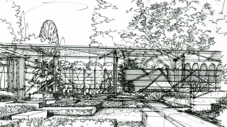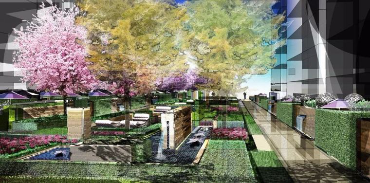售楼处建筑廊下用镜面不锈钢墙面处理,映像外部花园,利用反射的增大视觉及花园空间,此处植物采用柔和色及互补色的植物色彩设计手法。