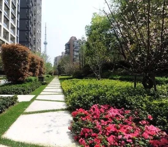 杭州新湖武林国际同样在小地块中用植物去营造空间,实现小中见大的效果。在色块塑造空间的基础上,增强了对比色的运用,运用与绿篱颜色对比度极其强烈的花卉,强调了色块的界线与空间排布。