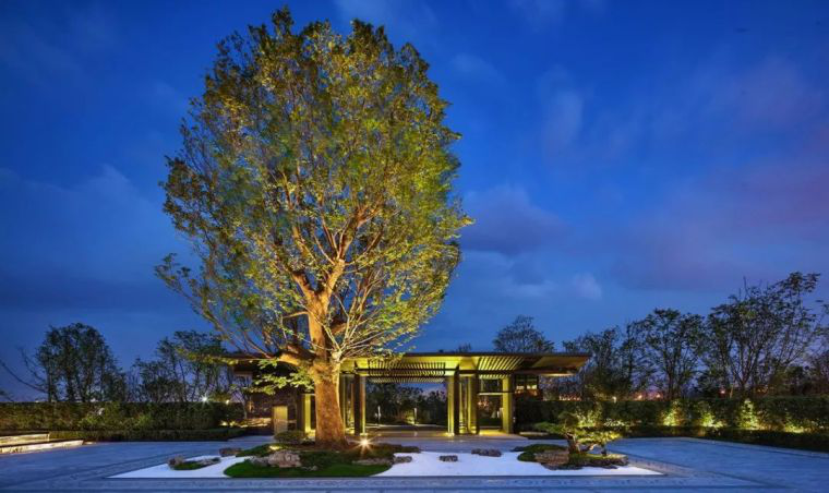 中国铁建重庆西派城营销中心的前广场处放置了一棵冠幅较大的主景树,作为入口门廊与地势较高的营销中心的过渡,让前广场区域简约又不失亮点。