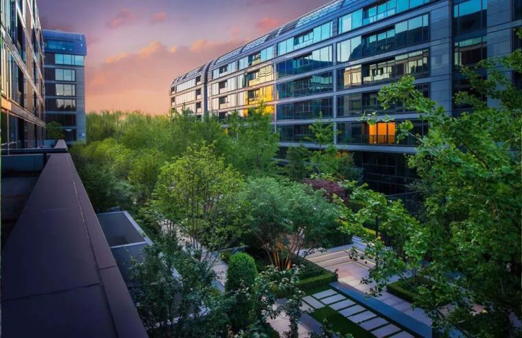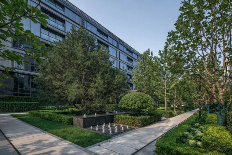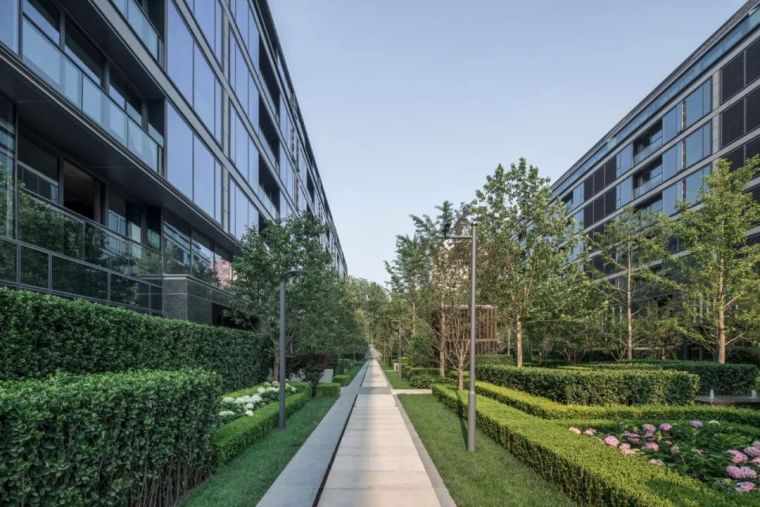 北京壹号院的夏景是不同层次的绿色构成的的像素花园,人们的注意力多集中在规整的灌木及点缀其中的花卉,现代中又不失浪漫。