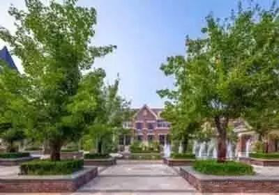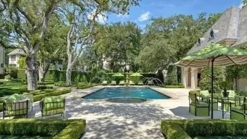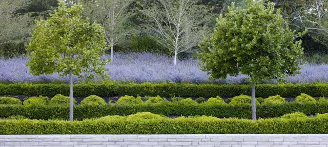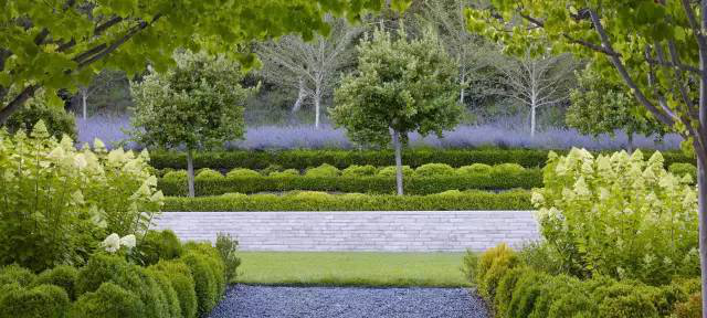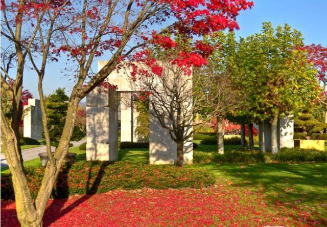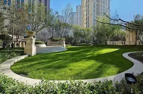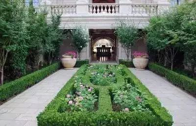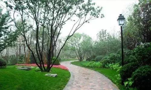 层次丰富的乔木与规则式绿篱及地被花卉形成的色调相宜,高低错落的植被群落效果