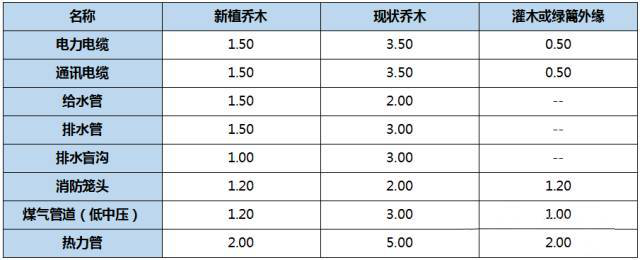(注:乔木与地下管线的距离是指乔木树干基部的外缘与管线外缘的净距离。灌木或绿篱与地下管线的距离是指地表处分蘖枝干中最外的枝干基部的外缘与管线外缘的净距。)