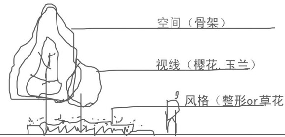 在一个组团内要考虑植被的立面效果,简单理解就是要有型~(轮廓线)--要保证有骨架大树撑着,其他的二乔 灌木就不容易散掉,什么是组团的骨架? 大家想想