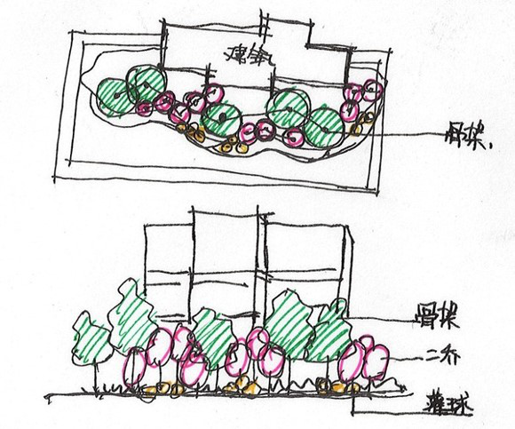 植配是辅助景观设计的,是设计中的软景体现,可以更好的营造空间,增强景观氛围和感觉,有想法的植配是会让人感到非常舒服或有想象空间的。在做植配方案时,要找到理由(以免别人乱改你的方案)要结合功能,考虑人的体验和使用,品种其次。当你把握不好时,就把你配的植物从平面拉出立面草图勾一勾,大概就知道改哪里了。千万不要有空隙就塞一棵,也不要撒豆子 ,要寻找之间的联系。