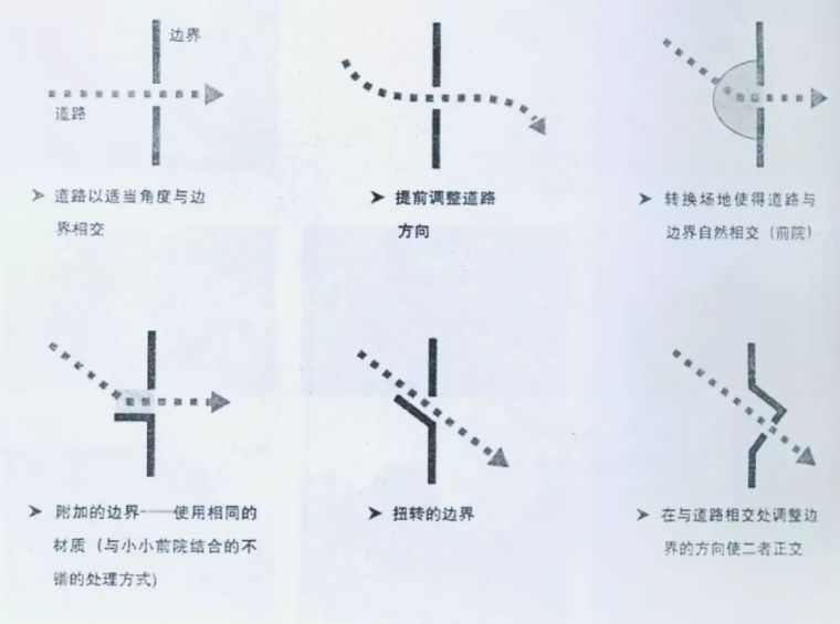 道路与边界应读以适当的角度相交。如果道路需要旋转一定方向与边界相交,可以提前做适当的处理。包括提前调整道路的角度,在边界前留出一块转换空地或者使得边界与道路的方向相呼应。