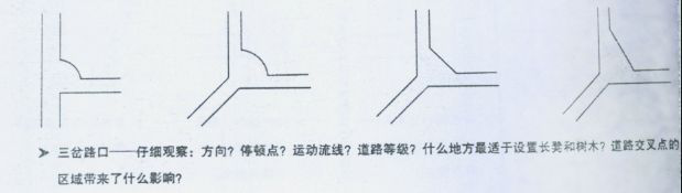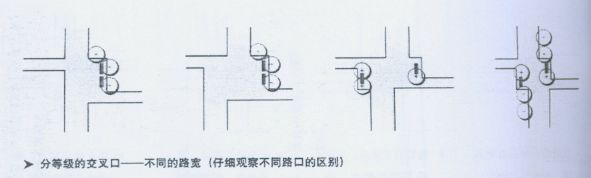 道路连接点与公路连接点不同,需要一些停顿区域。使用者在此稍作停顿,观察选择自己的运动方向。因此,连接点需要在交叉路口加宽,有足够的空间。但是仅仅加宽道路并不会自动产生一个宜人的道路连接点。