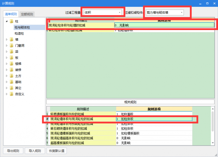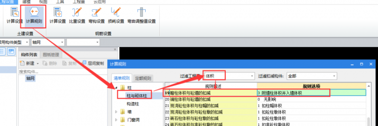 方法二:查看工程设置,计算规则中柱与墙的扣减关系,看是否是按附墙柱的计算规则计算的,若是则修改相应的计算规则,如图: