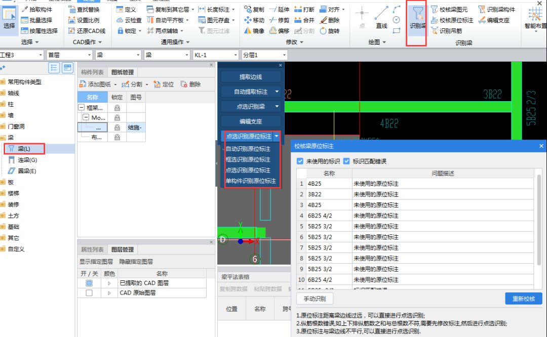 完成识别梁操作并调整支座正确后,点击识别梁--点选识别原位标注倒三角中的自动识别原位标注,软件则会自动识别,识别后弹出校核原位标注窗口,双击提示检查是否需要识别,若需要识别可以将未识别的点选识别或在原位标注中手动输入,若不用识别可以忽略。