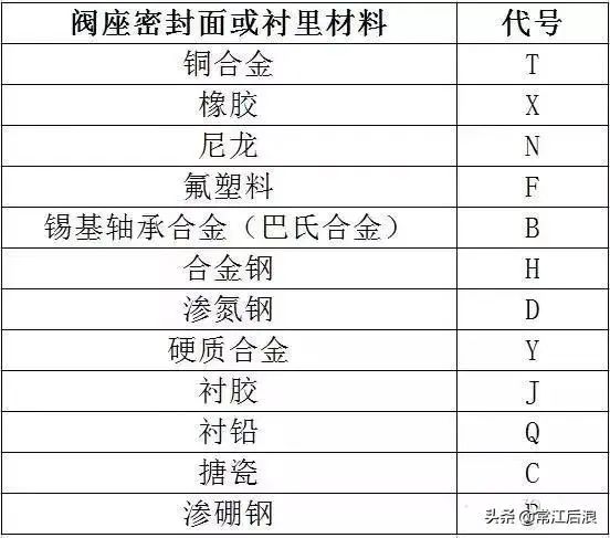 第五单元为阀座密封面或者衬里材料代号,用汉语拼音字母表示