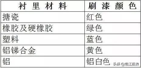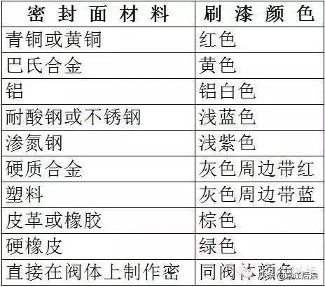 表示密封面材料的油漆,刷在手轮、手柄或自动阀件的盖上,其颜色与密封面材料的关系如下: