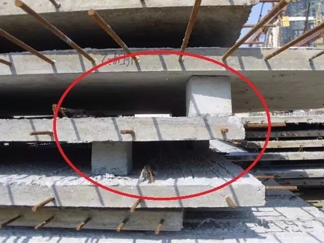 预制构件现场随意堆放,出现上下排木方垫块不在一条直线,极容易产生裂缝
