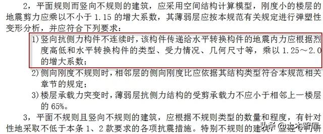 异形柱规程3.2.5的第四条要求,对于不规则的异形柱结构,其抗震设计应符合对于竖向抗侧力构件不连续时,构件传递水平转换构件的地震内力应根据不同条件和情况乘以1.25~1.5的放大系数。