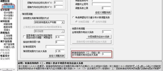 PKPM程序为了执行上述情况下三、四级转换构件的内力放大,提供了以下如图7所示的选项供设计师自己填入相应的放大系数,当填写了转换构件(三、四级)的水平地震作用效应放大系数,程序会自动执行内力放大。
